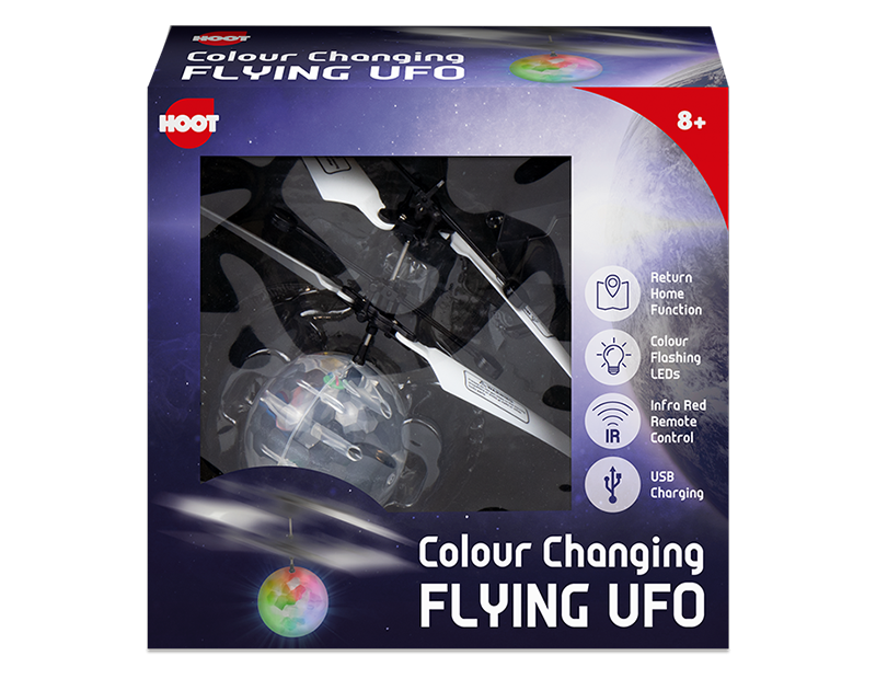 Remote-controlled colour-changing UFO is great for aviators and UFO enthusiasts. The flying UFO has a control distance of 5-8m. The USB micro charger is required to charge the UFO with 20-30 minutes required for a full charge. The infrared remote control is included. The UFO also features a return home function.