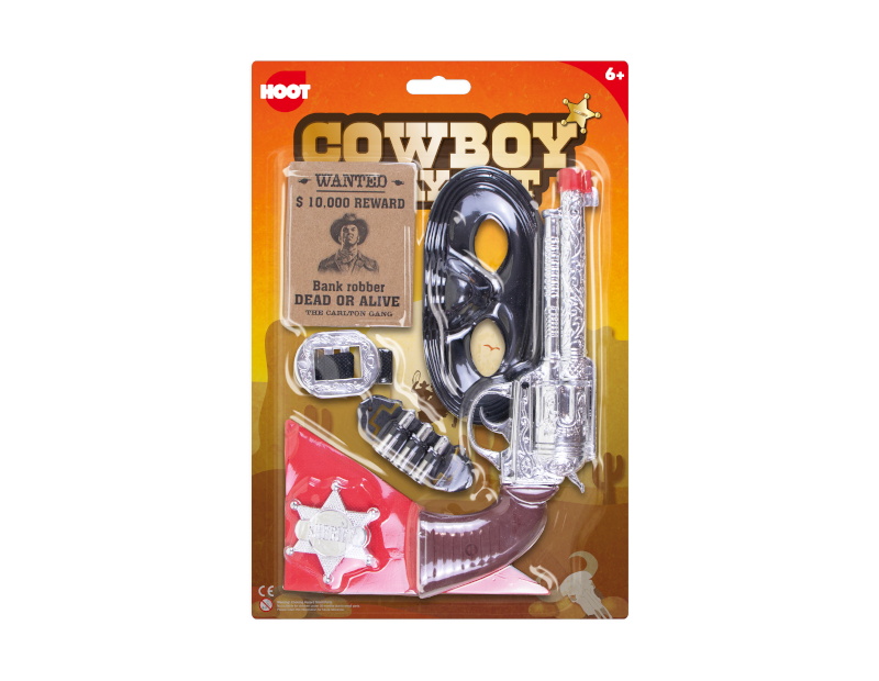 This fun Cowboy Play Set contains an assortment of plastic cowboy accessories for imaginative play.