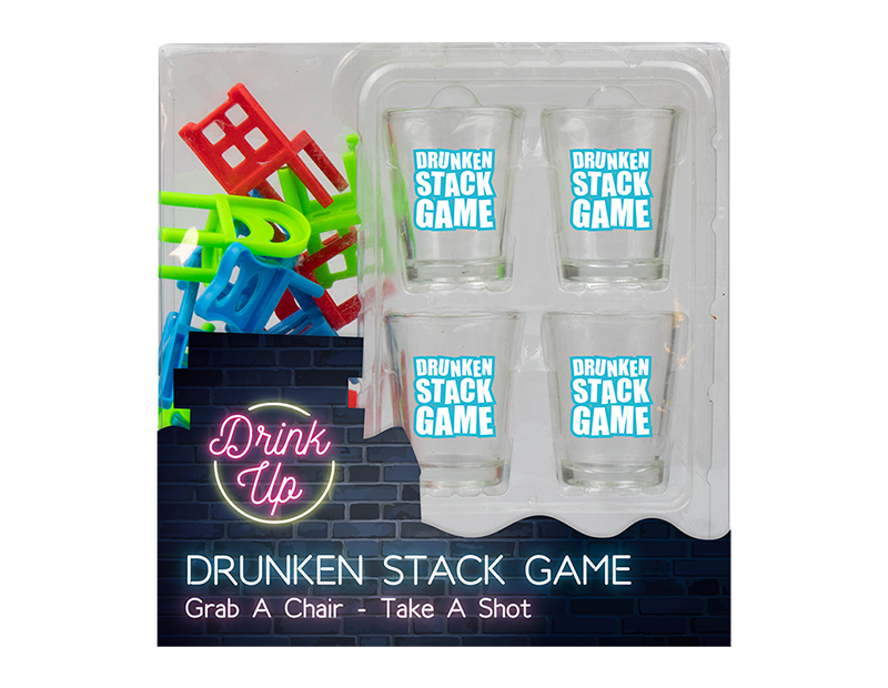 Suitable ages 18+ Stacking chairs and four shot glasses included.