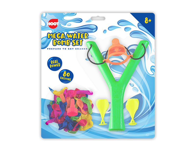 This pack of Sling Shot & Water Bombs contains a brightly coloured slingshot and eighty water balloons.