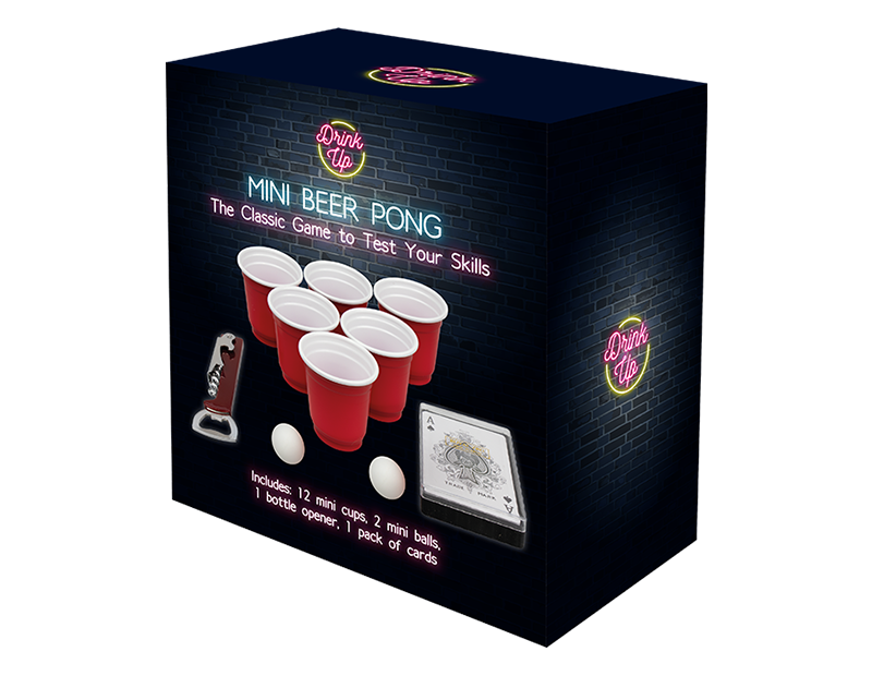 Each game includes 12 mini cups, 2 mini balls, 1 bottle opener and one pack of cards. Everything is required for a game of mini ping pong.