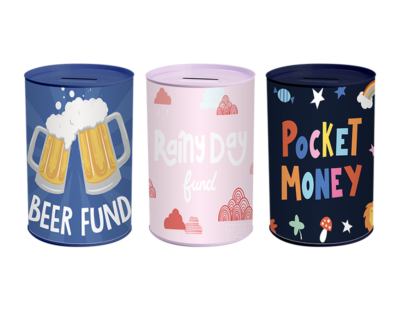 These Novelty Money Tins are 15cm in height and will hold approximately £100 in coins. Each money tin has been manufactured using tinplate and features a full colour printed design and a single money slot.