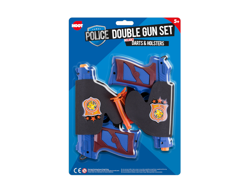This Police Gun Set contains two police pistols, complete with wearable holsters and four orange rubber suction cup darts.