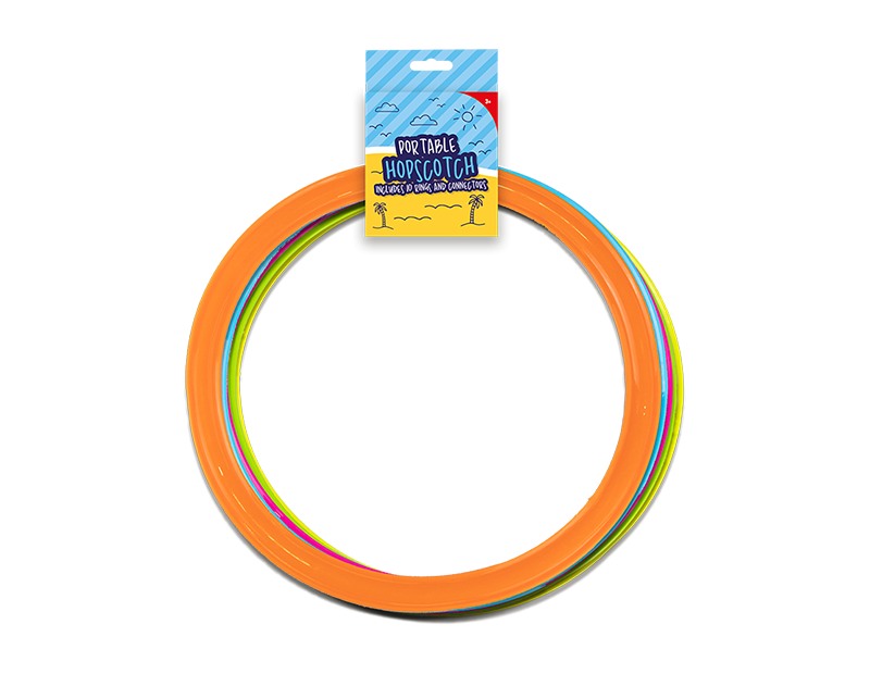 This Portable Hopscotch game includes 10 rings (2x green, 2x pink 2x blue 2x orange, 2x yellow) and ten connectors.