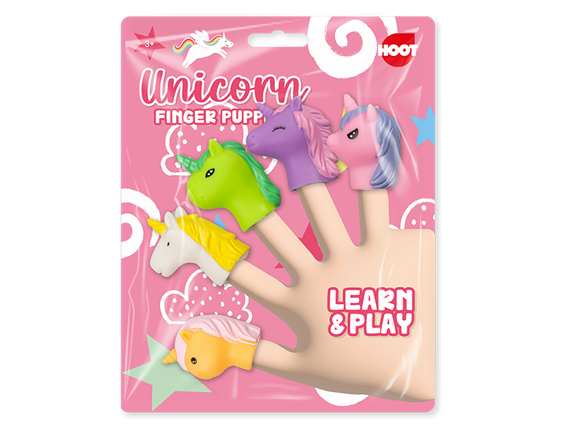 Each pack comes with five different coloured Unicorns, one for each finger. The unicorns all have different expessions, perfect for story telling.